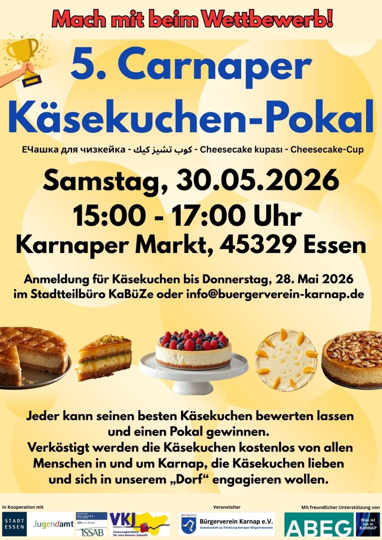 Anmeldung: Sie können sich mit dem Anmeldeformular bis Donnerstag, 28. Mai 2026 im Stadtteilbüro KaBüZe oder per E-Mail an info@buergerverein-karnap.de anmelden. Kuchenabgabe: Bitte geben Sie Ihnen Käsekuchen am Samstag, 30. Mai 2026 zwischen 12:00 Uhr und 14:00 im Stadtteilbüro Karnap, KaBüZe, Karnaper Str. 100, 45329 Essen, ab.