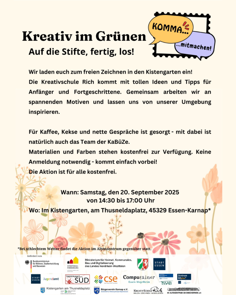 Am Samstag, 20. September 2025, von 14:30 bis 17:00 Uhr, öffnet der Nachbarschaftsgarten „Kistengarten“ am Thusneldaplatz (Thusneldaplatz, 45329 Essen) in Karnap seine Türen für die Aktion „Zeichnen im Grünen“.