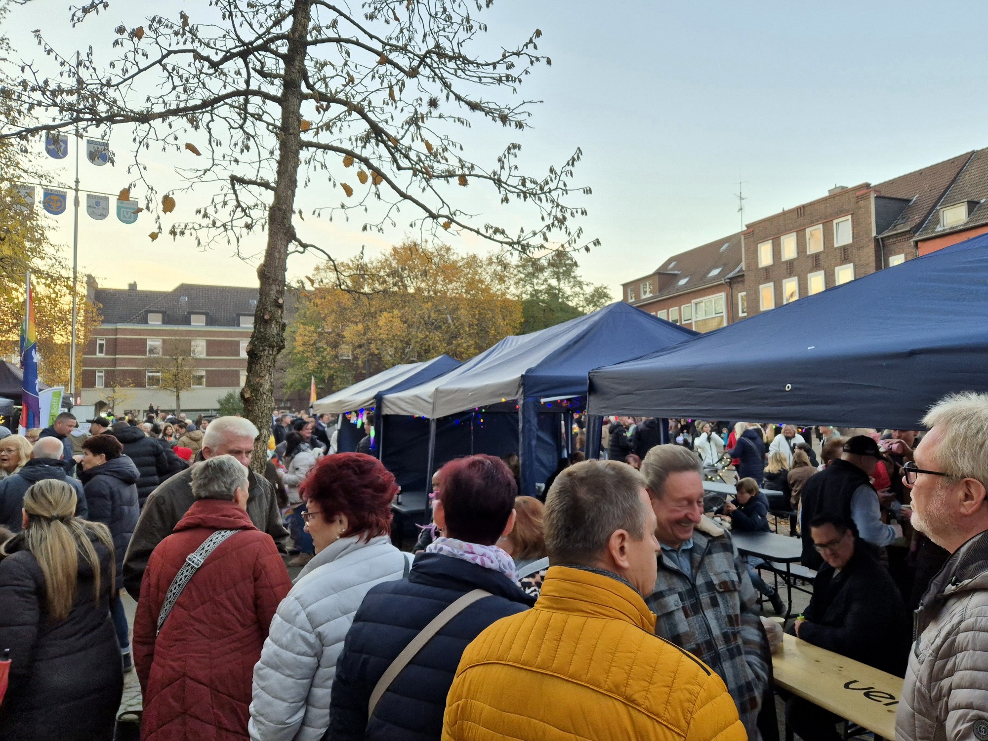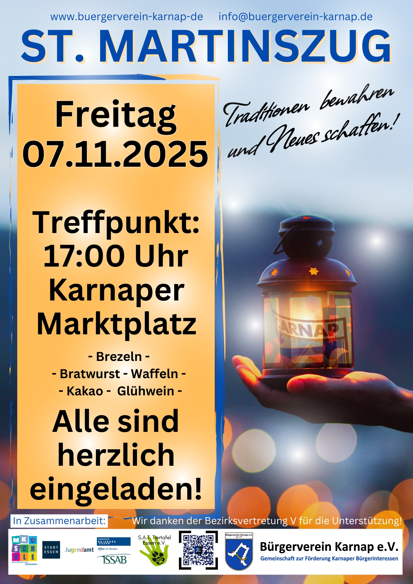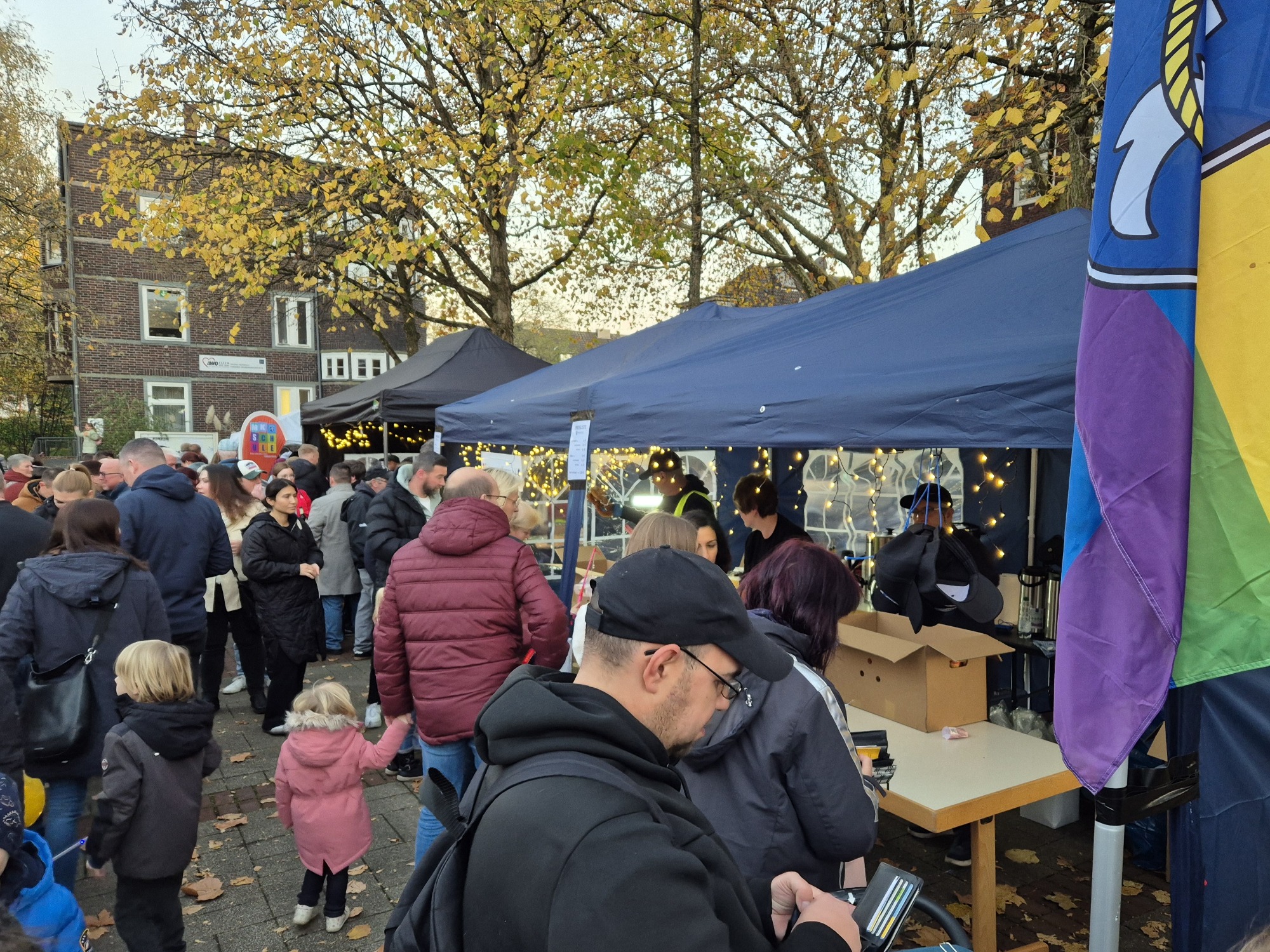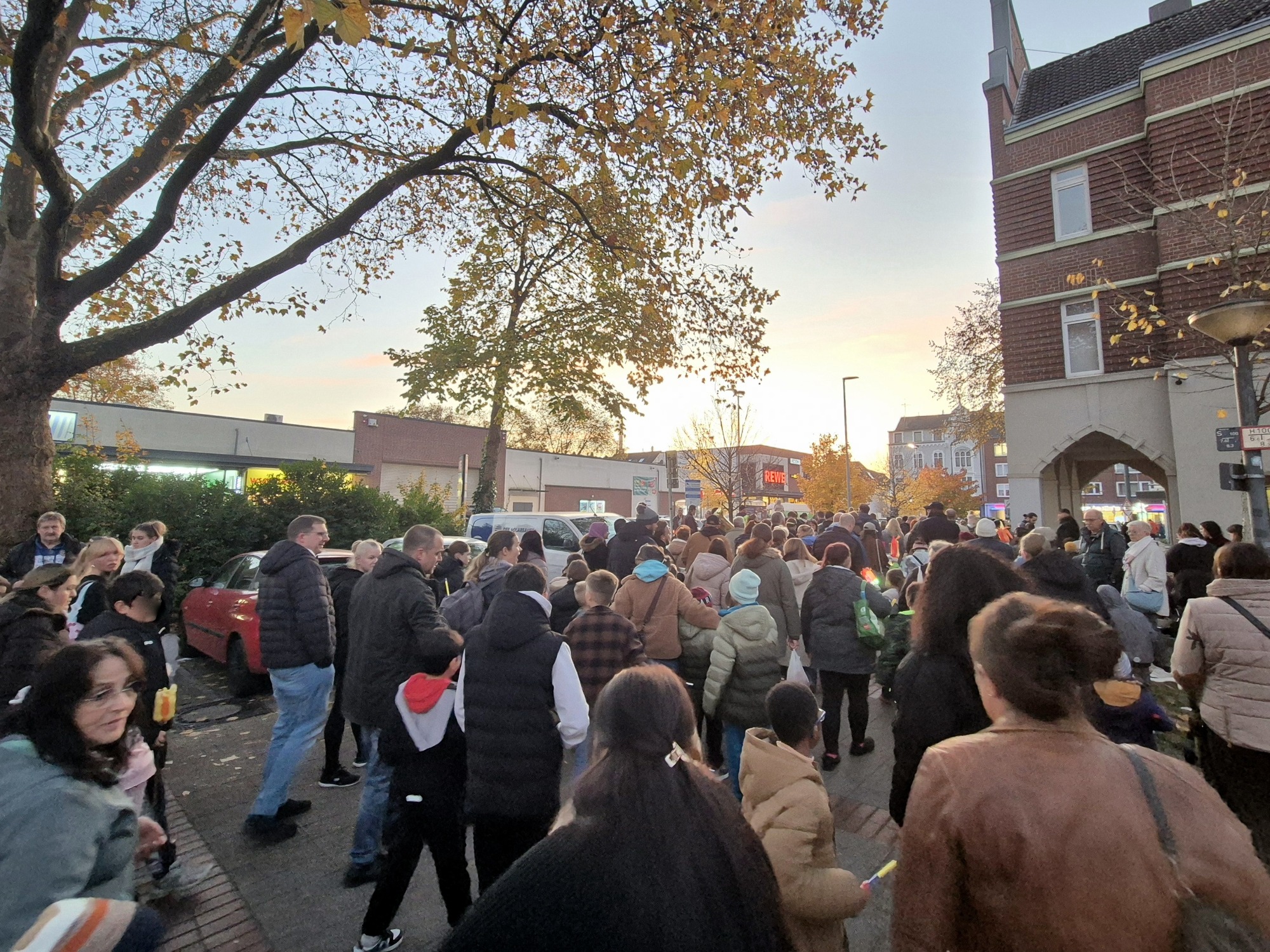 Der diesjährige St. Martinszug in Essen-Karnap versammelte Hunderte von Menschen gegen 17:00 Uhr auf dem traditionellen Startpunkt, dem Karnaper Marktplatz. Zur Verkürzung der Wartezeit und zur Stärkung der Besucher gab es ein reichhaltiges Angebot an Kakao, Glühwein, Bratwurst und Waffeln. Musikalisch untermalt wurde dies von der Ruhrpott Orgel. Selbstverständlich durften die Martinsbrezeln nicht fehlen, die mit bunten Bändern zum Umhängen verteilt wurden. Um das gemeinsame Singen zu ermöglichen, wurden Textblätter an alle Besucherinnen und Besucher ausgegeben.