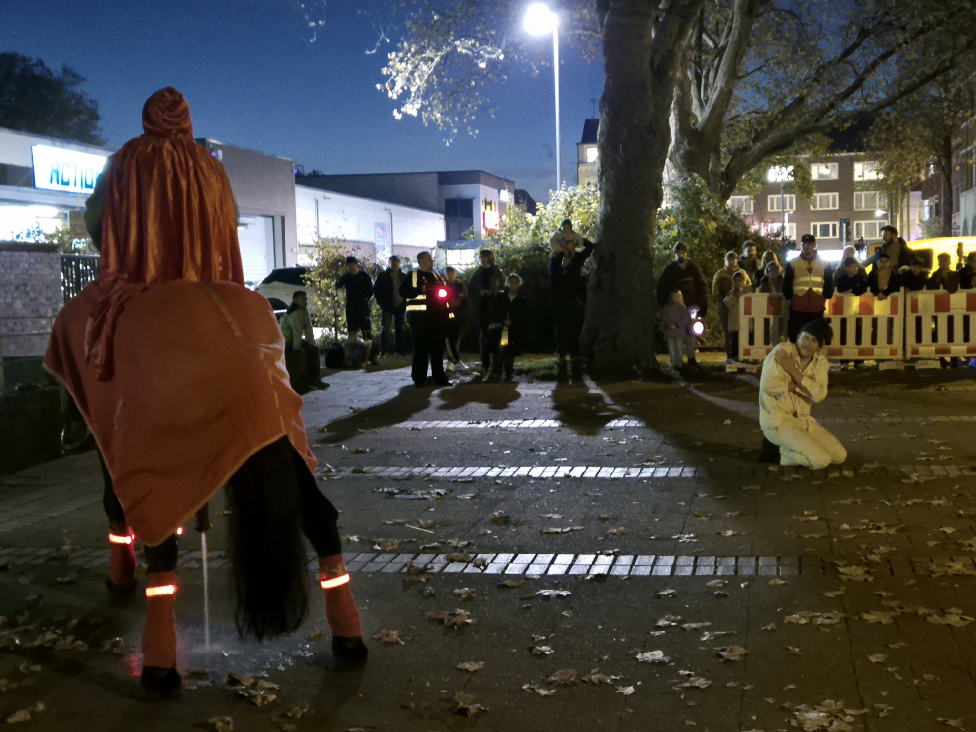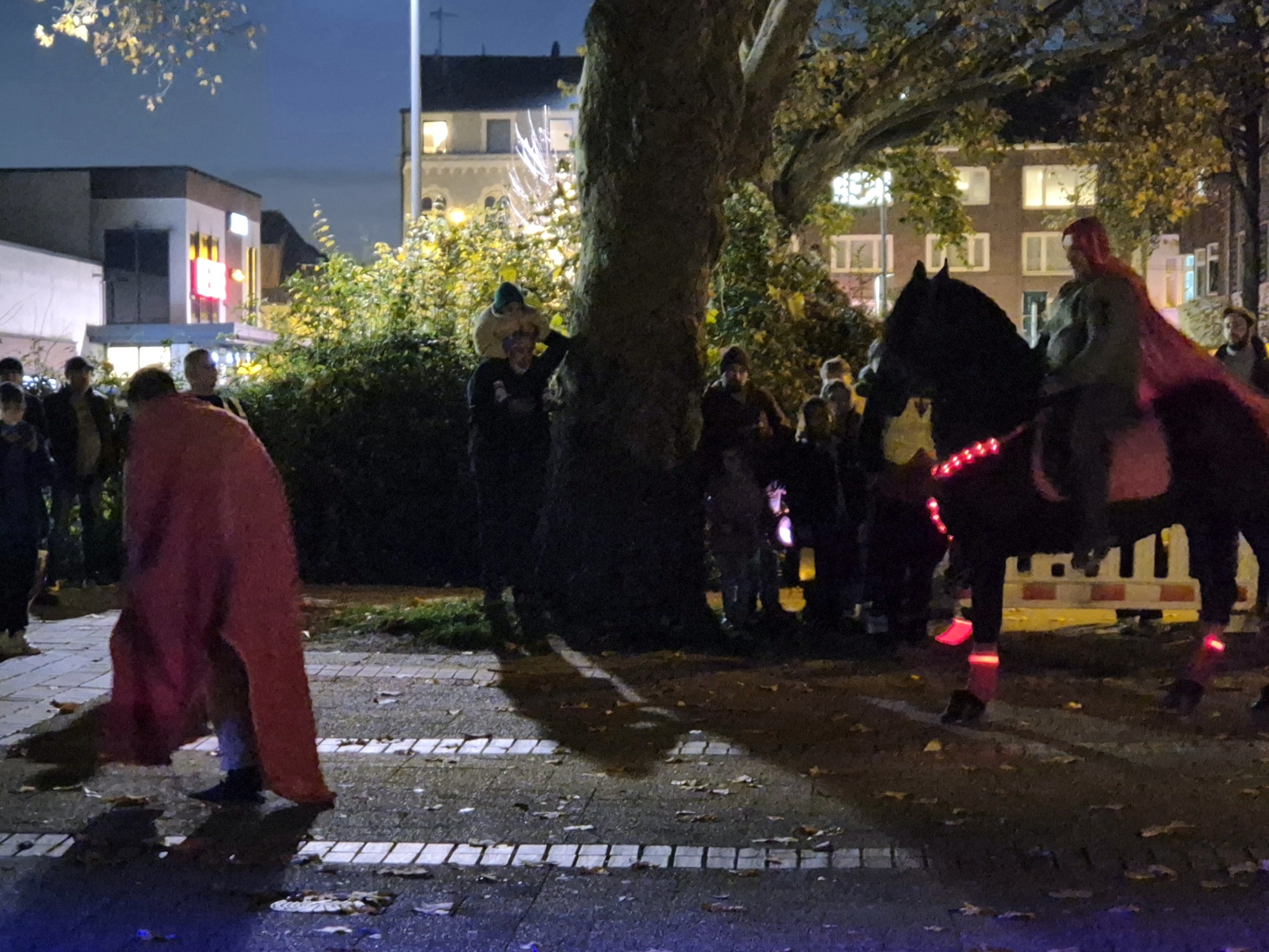 Der Umzug zog, begleitet von Kapellen und Musikwagen, mit vielen bunten Laternen und leuchtenden Puscheln singend durch Karnap. Direkt hinter St. Martin sicherte der Bürgerverein mit einem Banner den Sicherheitsabstand zum Pferd. Ein Höhepunkt war die feierliche Mantelteilung vor der Maria-Kunigunda-Schule. Dort trug in diesem Jahr ein Lehrer der Maria-Kunigunda-Schule die bewegende Geschichte von St. Martin vor, der seinen Mantel mit dem Bettler, gespielt von Kevin Polk, teilte.